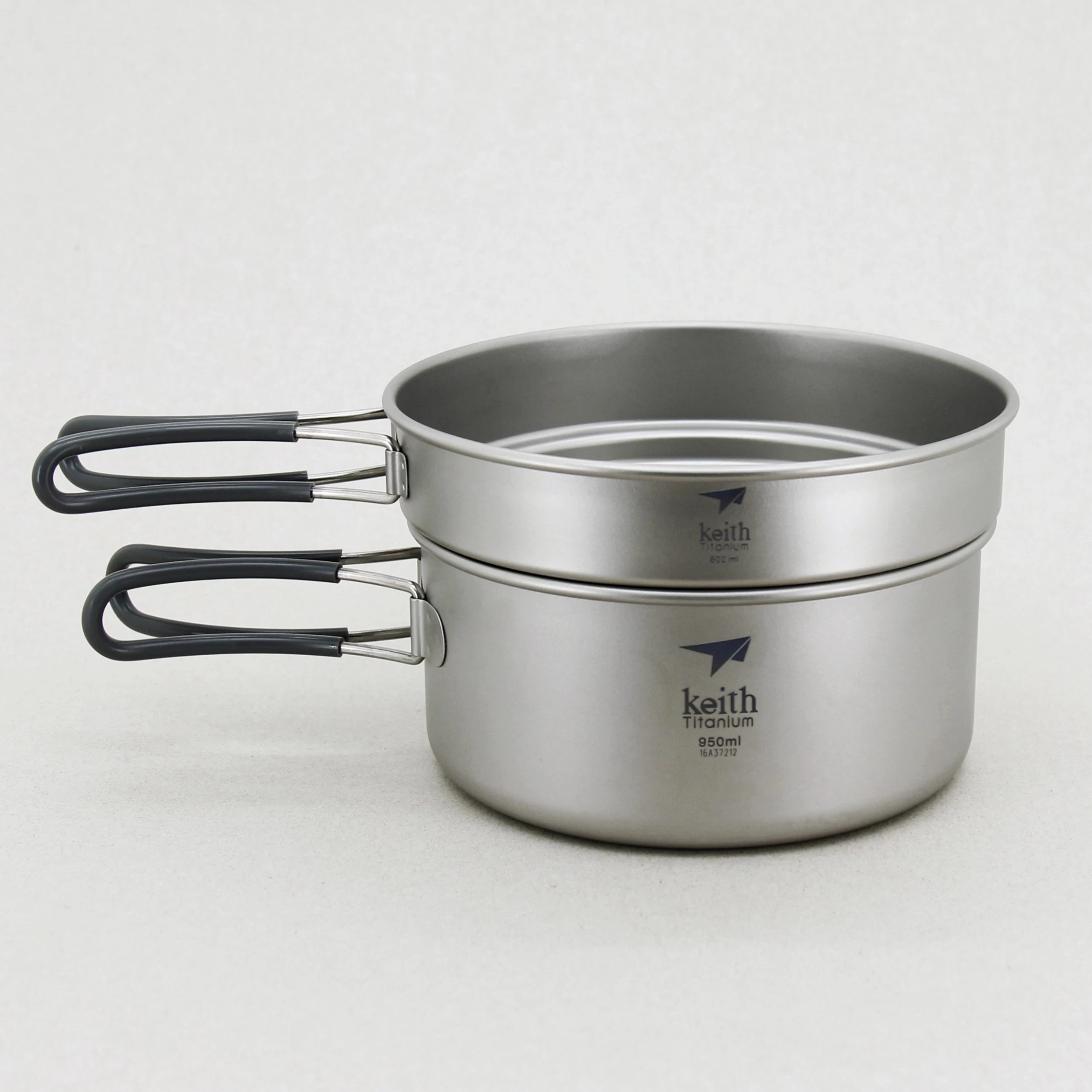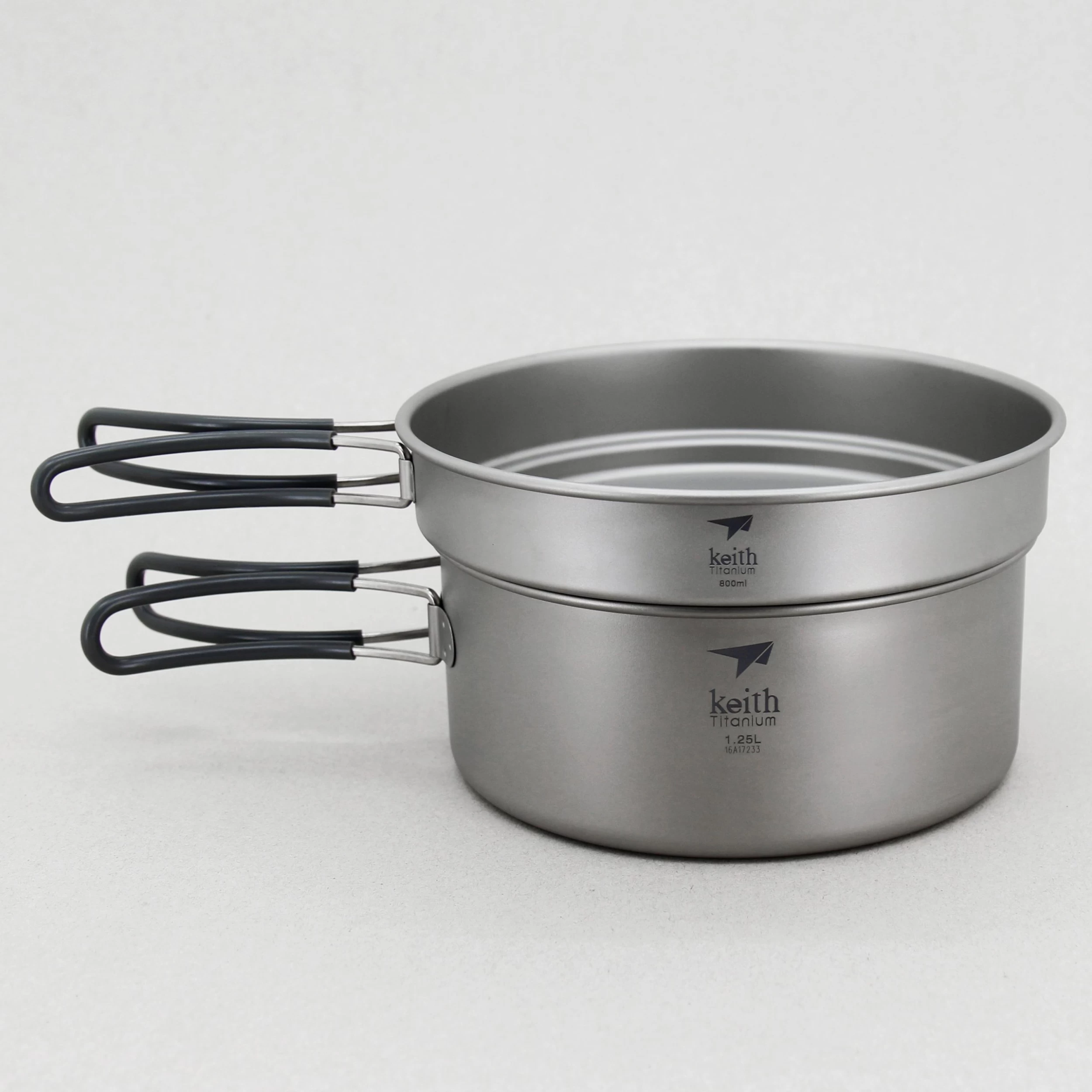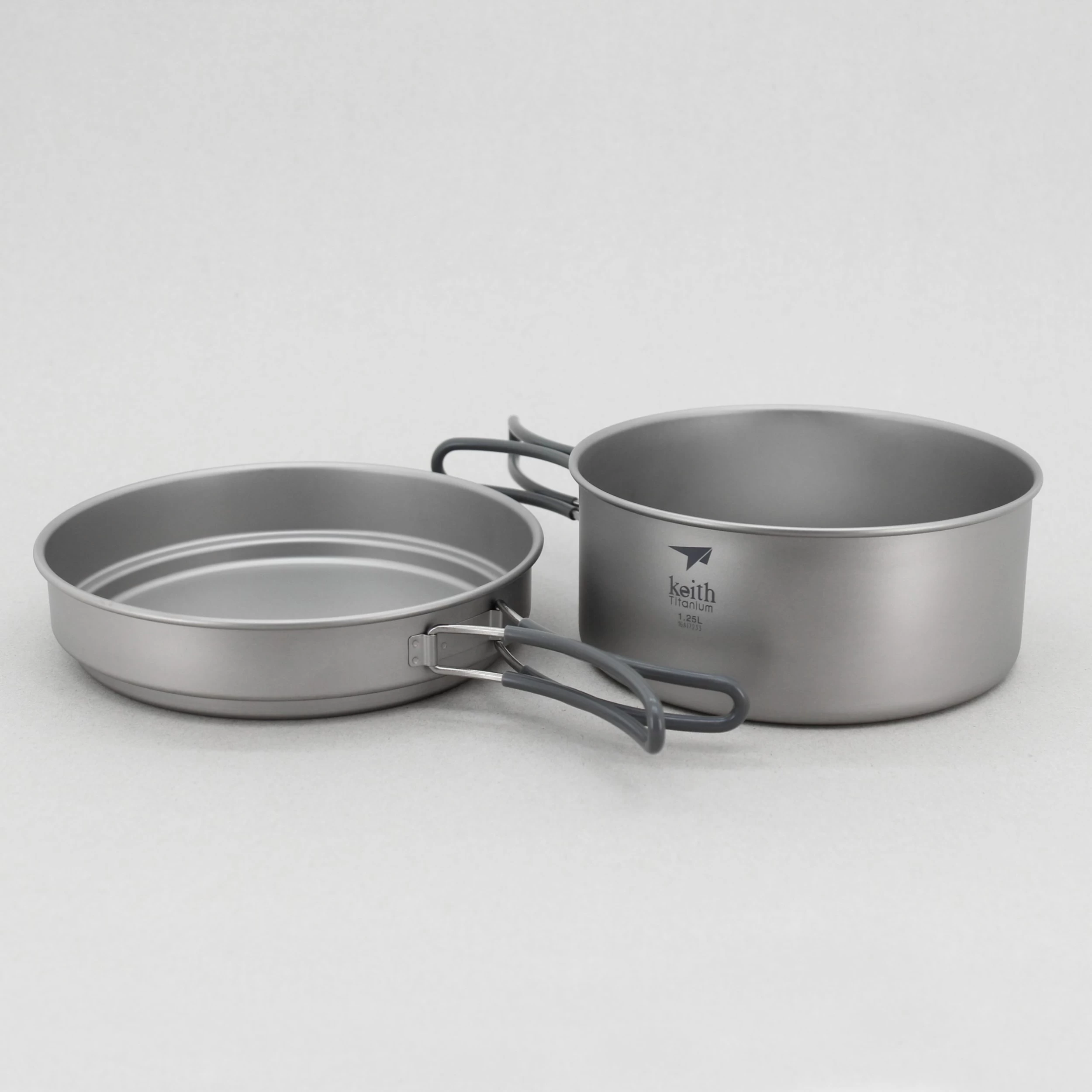 The 2-Piece Titanium Pot and Pan Cook Set from Keith is an ultralight camping cook set made from titanium.
