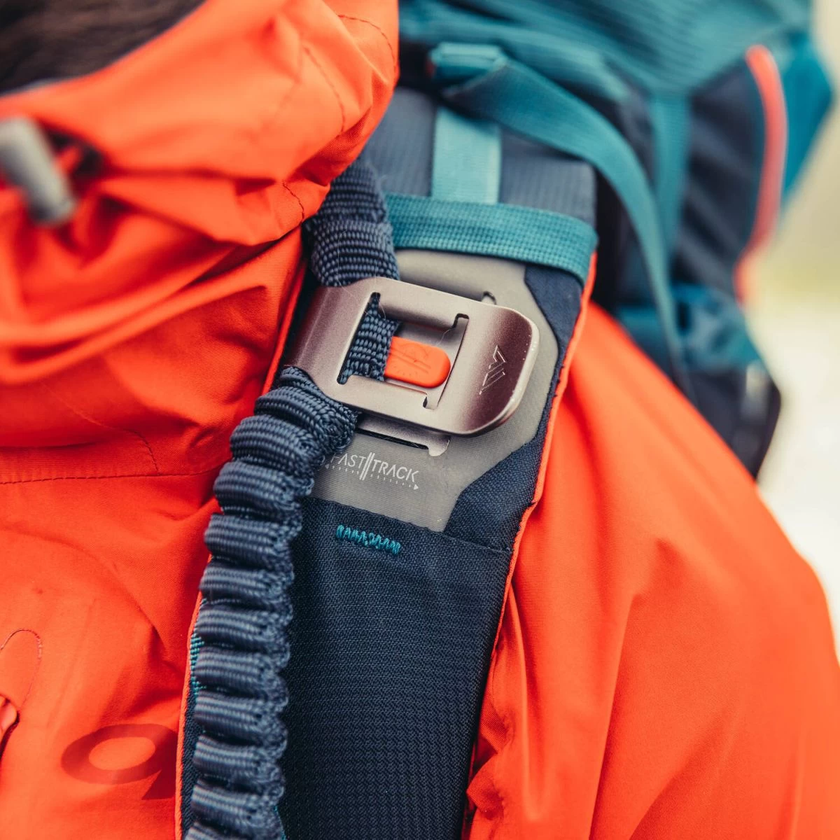 • Reinforced, coated webbing loop and elasticized webbing for ski attachment with custom FastTrack hook