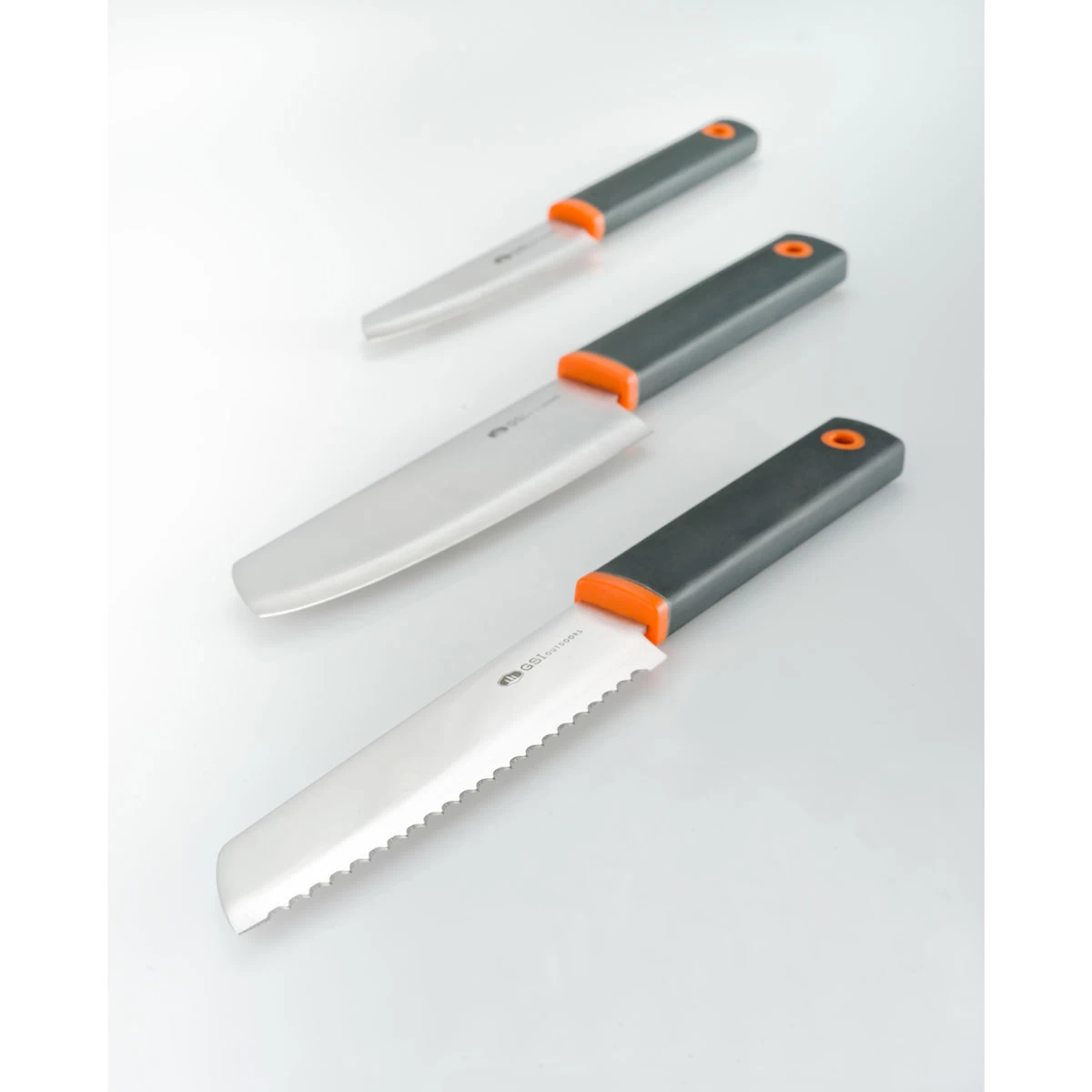 The GSI Santoku Knife Set includes a 4″ paring knife, 6″ santoku and 6″ serrated knife, a cutting board, bottle for soap and a two sided dish cloth to keep everything tidy. Weighing in at just under 2 pounds, this compact set included a nylon case to keep all your prep gear securely and neatly organized no matter where your knife skills are in high demand.