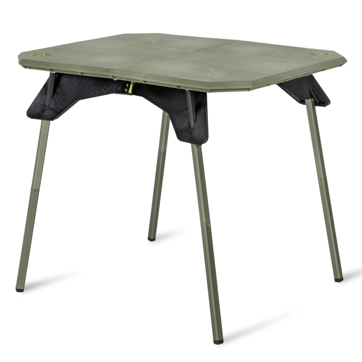 Custom engineered aluminum hinges, and aluminum legs integrated with carbon fiber and zinc pole tips for a stable and supportive outdoor camp table.