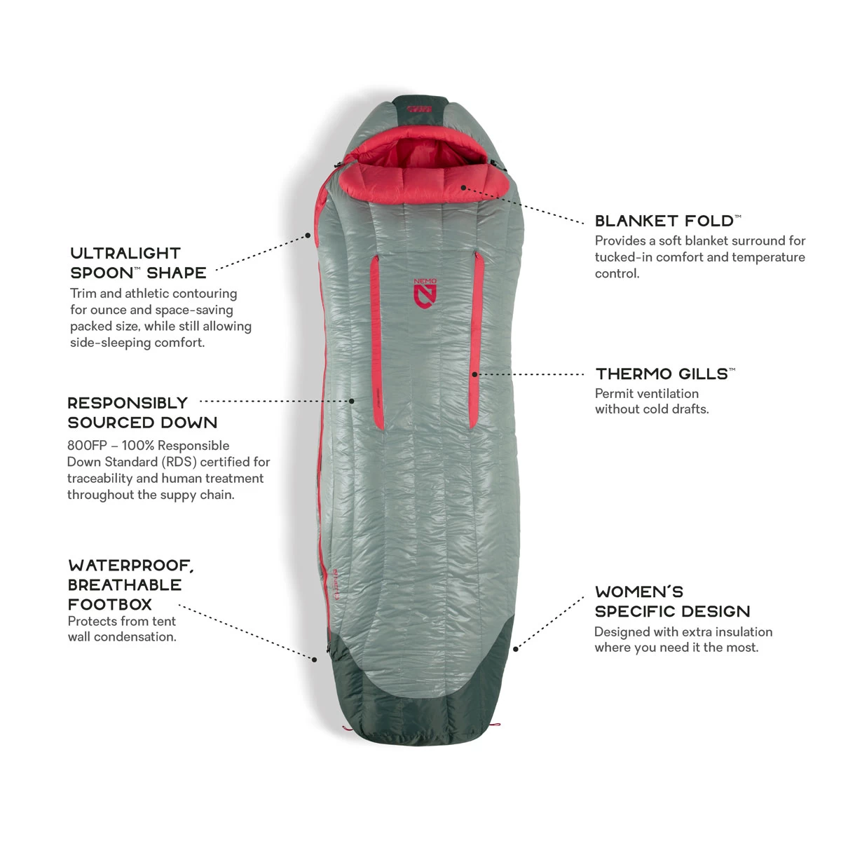 The Riff 15 is NEMO’s top-of-the-line backcountry Spoon™-shaped sleeping bag. This pinnacle performance 800-fill down bag offers a more athletic cut, designed for side sleepers who prefer space-saving packability and shaving critical ounces for long hours on the trail.