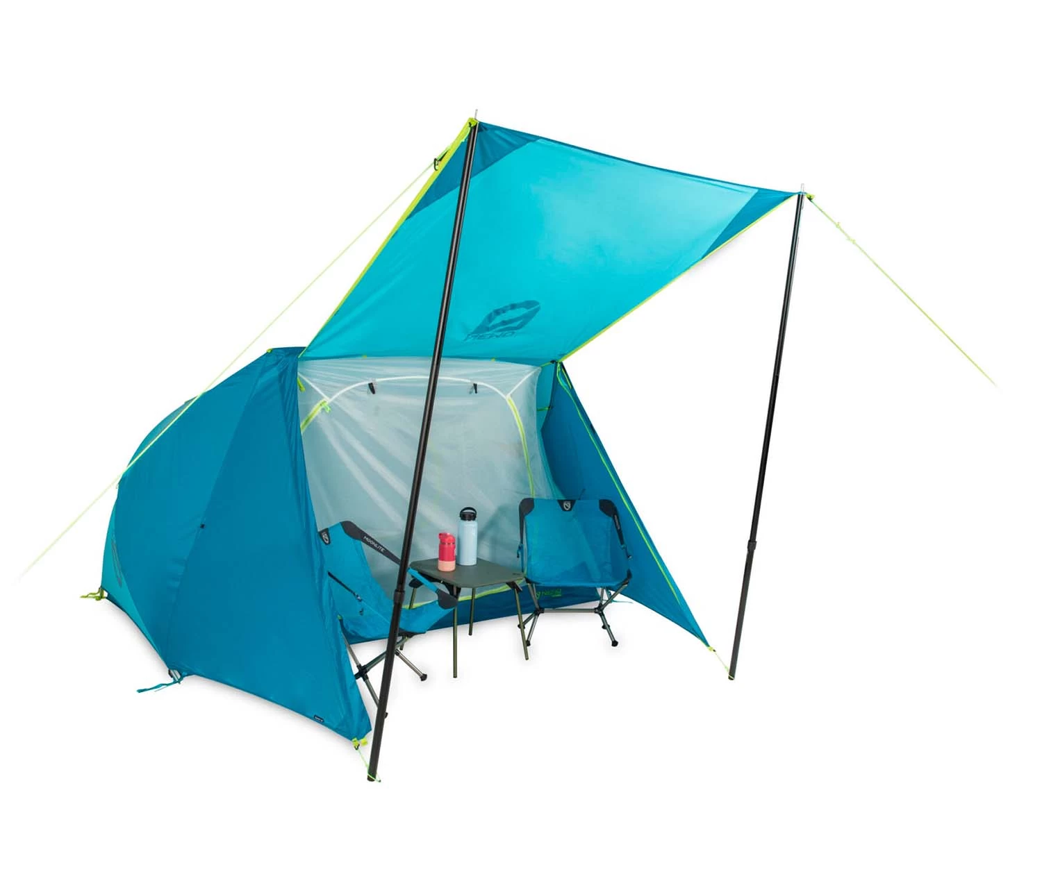 Whether your adventures require a tent, a screenhouse, a sunshade, or all three, the NEMO Switch 2P can easily transform to handle all of them. With the inner tent deployed and fly attached, it makes a very comfortable abode, with near vertical walls and copious headroom. Pop the fly off on a sunny day, and you have a perfect screen room for setting up a couple of NEMO Moonliteâ„¢ chairs and a Moonlanderâ„¢ table for sharing a cheese board.