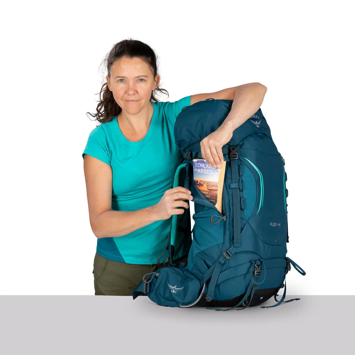 Exploring the sandstone canyons of the desert, thwacking through routes filled with pokey brush and trees, or clearing wilderness trails with Pulaski ax in hand—this is what the women’s-specific Kyte 46 was made for. Built with durable fabrics for demanding outdoor conditions and activities, the Kyte has all the features you need to enjoy the experience and get the job done. The integrated raincover deploys quickly to keep your gear dry, the rear stretch mesh shove-it pocket stores small items like a jacket for quick access, and Stow-on-the-Go trekking pole attachment makes it easy to free your hands without stopping to take your pack off. Like all Osprey packs, it also includes unparalleled fit and comfort.