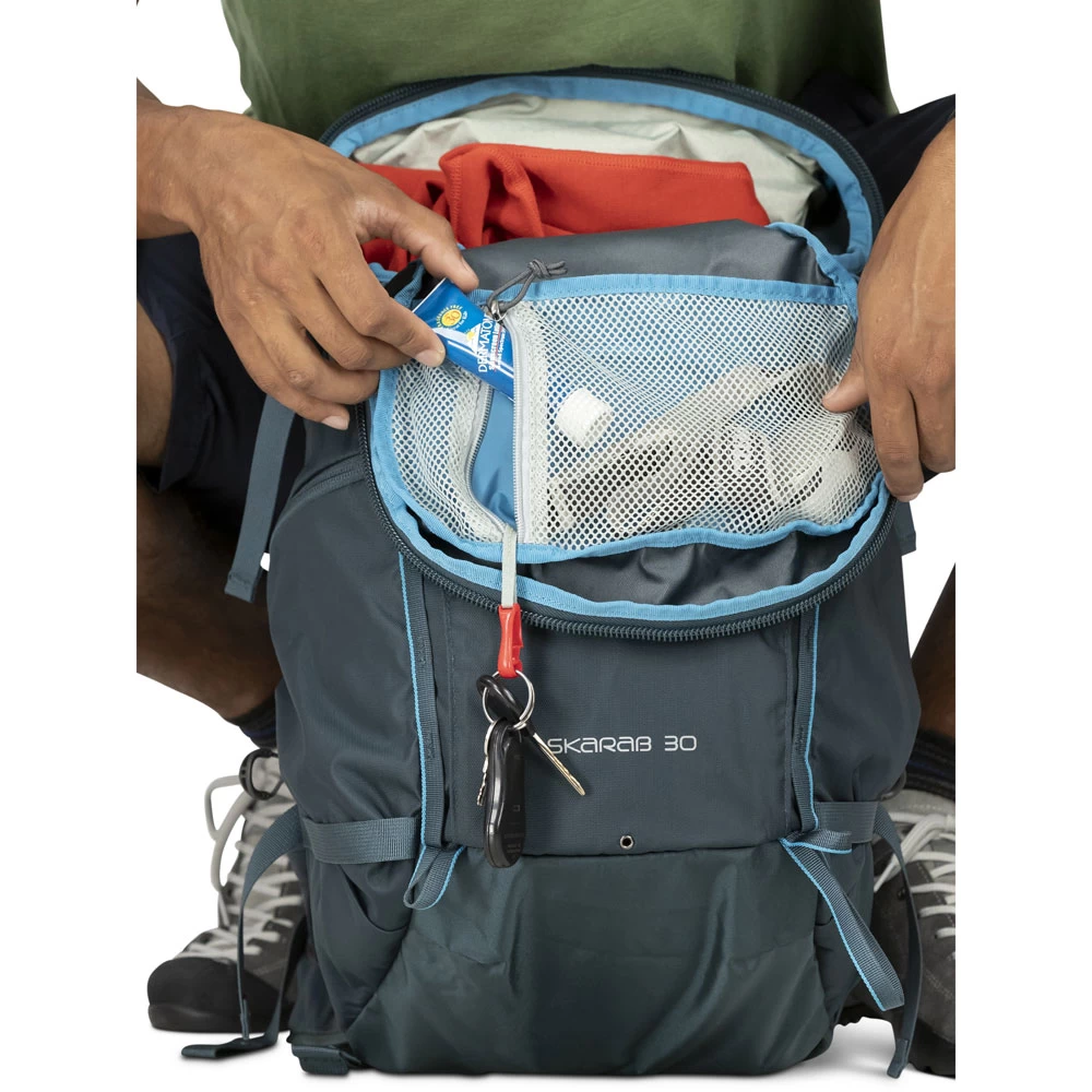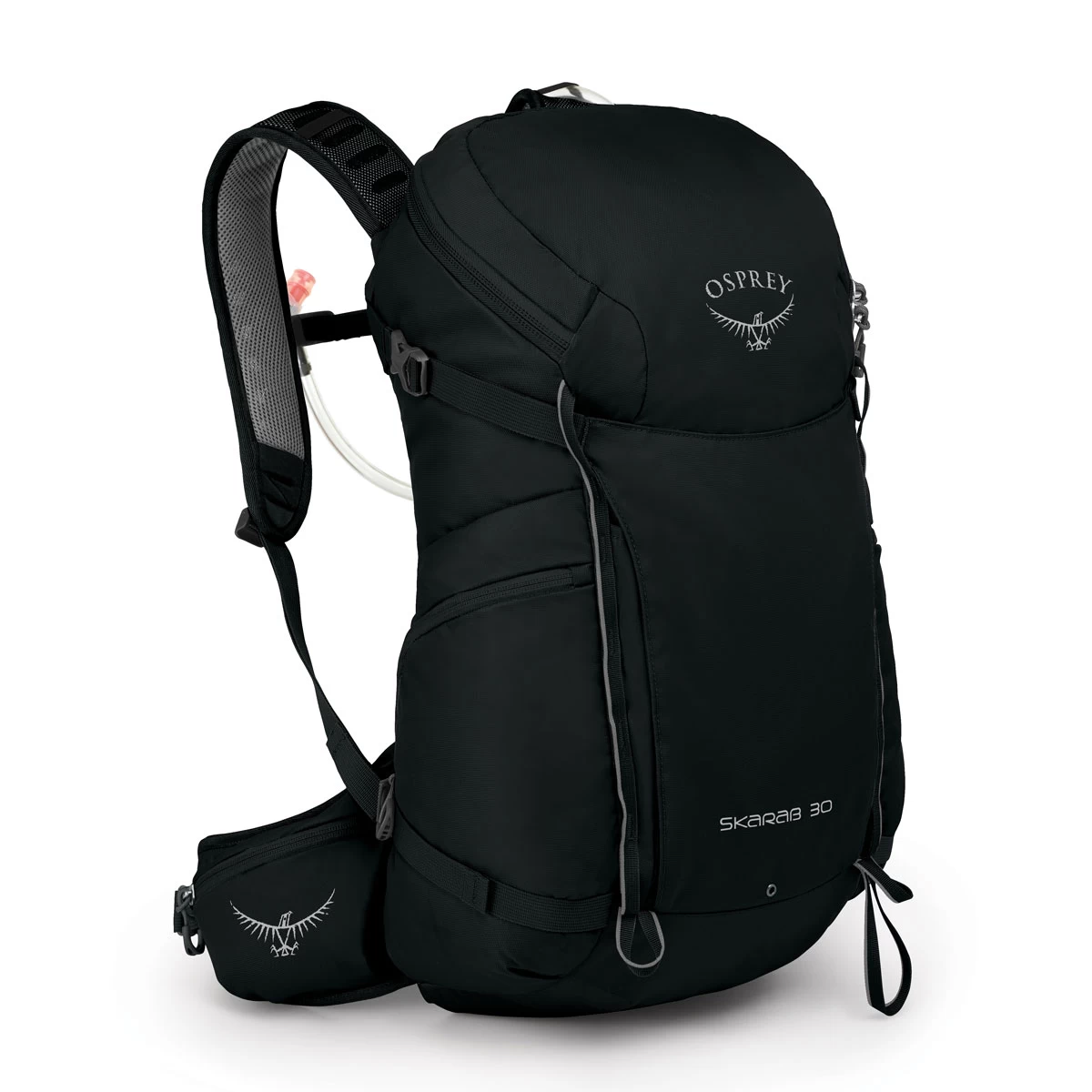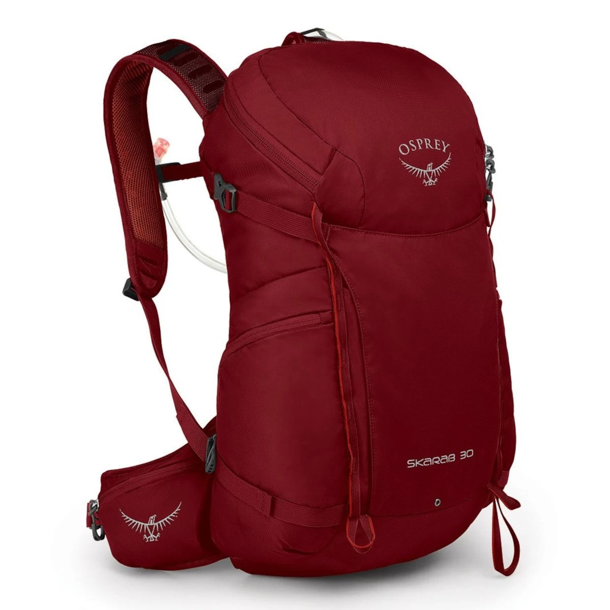 Featuring a time-honored yet fresh rucksack design and bucket-style opening for straightforward packing, the Skarab 30 is ready for adventure anywhere. Whether you’re heading to a music festival or hiking up a mountain, stay hydrated all day long with an included 2.5-liter reservoir. Osprey’s proven AirScape suspension and backpanel provides superior comfort and ventilation, dedicated attachment points secure your trekking poles when you need two hands, zippered side panel pockets offer plenty of options for organizing your stuff, and a front panel pocket is the perfect place to shove that extra layer. When you’re not stuffing the pack full, stabilize your load with dual upper and lower compression straps. You probably think we forgot about the snacks. (Please.) Zippered side hipbelt pockets keep food and other small items at the ready.
