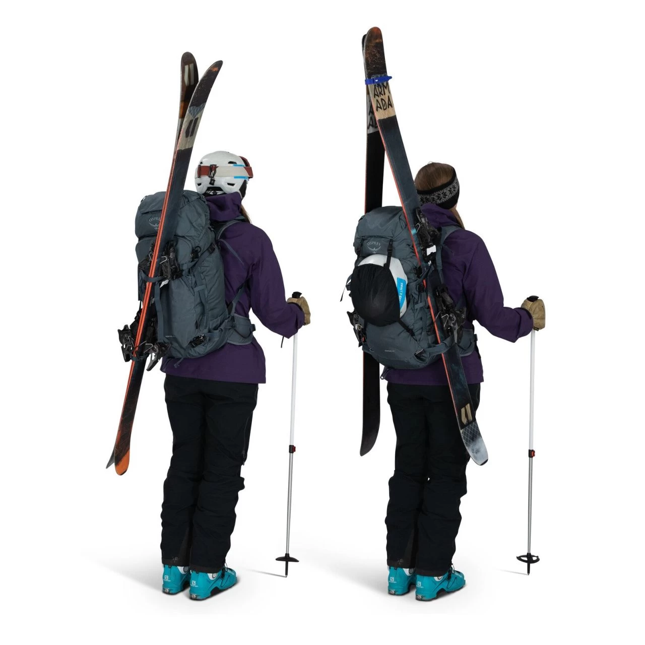 Planning, gear and easy access to avalanche safety equipment are essential for big days in the backcountry. Osprey’s largest technical backcountry ski pack, the women’s-specific Sopris 40 offers both ski and snowboard carry options. Top-end materials keep it as lightweight as possible while a stable fit make for dynamic descents. Easily access your avalanche safety kit through the front panel pocket while the top and backpanel provide two ways of accessing the dry main storage compartment. Made with a PFC-free DWR coating that sheds moisture.