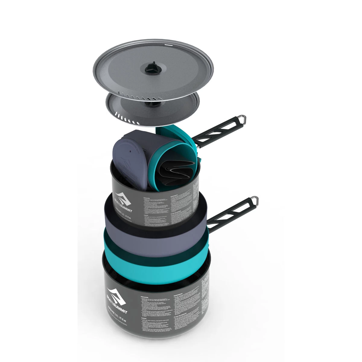 Getting tasty meals cooked in the outdoors is as simple as starting with the Sea to Summit Alpha 2 Pot Cook Set 2.2. This incredibly versatile pot and dinnerware set is perfect for campers who like to have options. The pots are constructed from a hard-anodized aluminum for incredible versatility with any camp stove and long-lasting durability. The large pot is perfect for a two-person meal, and the smaller pot can prepare any sides. With the DeltaLight Bowls and Insulated Mugs nesting right inside the pots, you can pare down for solo adventures, or add more bowls and mugs with ease.