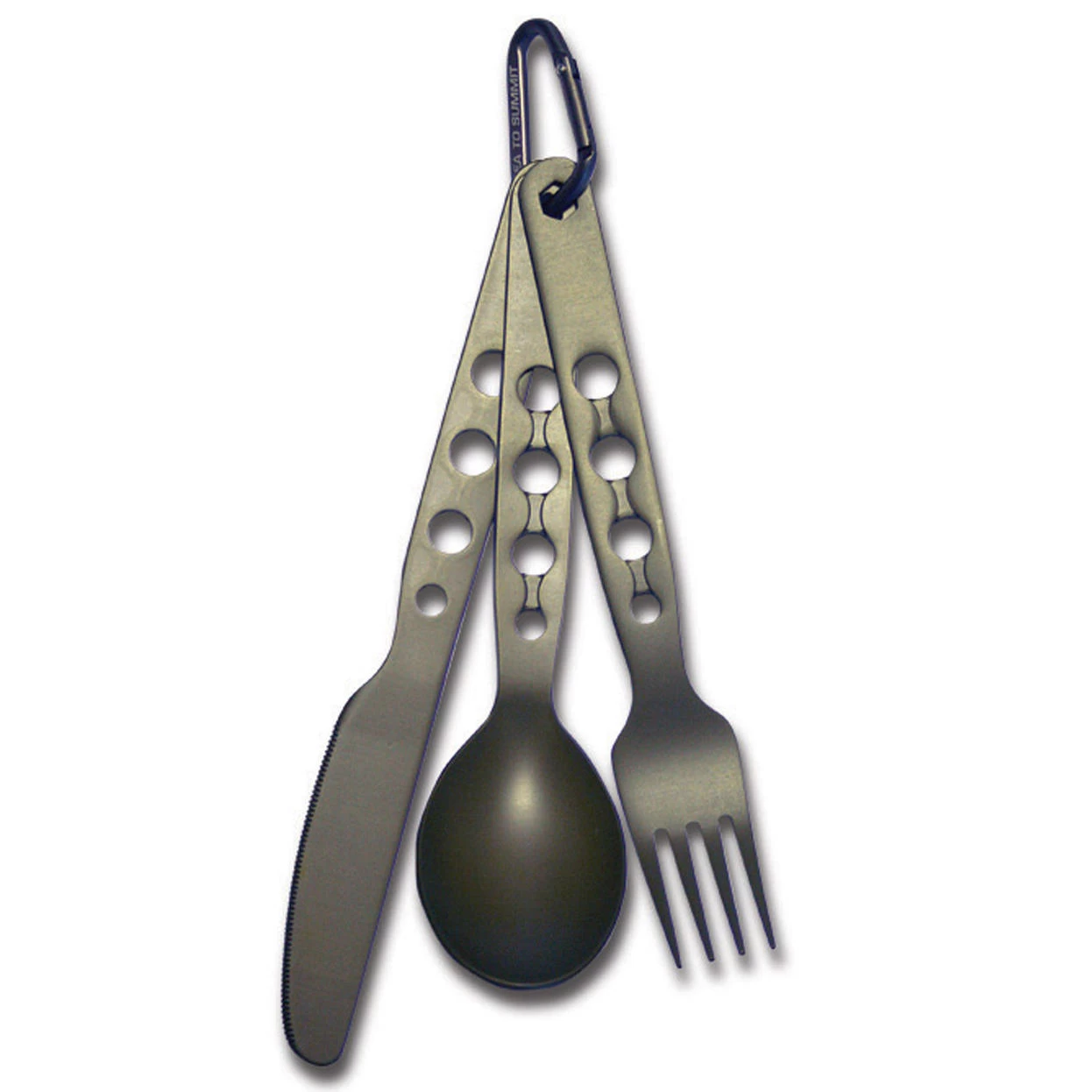 The Alpha Set from Sea to Summit features utensils with thicker and sturdier handles than the AlphaLight utensils, but that are still very lightweight. The set includes a Knife, Fork and Spoon (3 items) plus a mini-carabiner to hold them together. At the end of each utensil the cut out hole is hexagonal shaped, so that you get three different size hex wrenches (3 mm, 4 mm & 5 mm) built in.