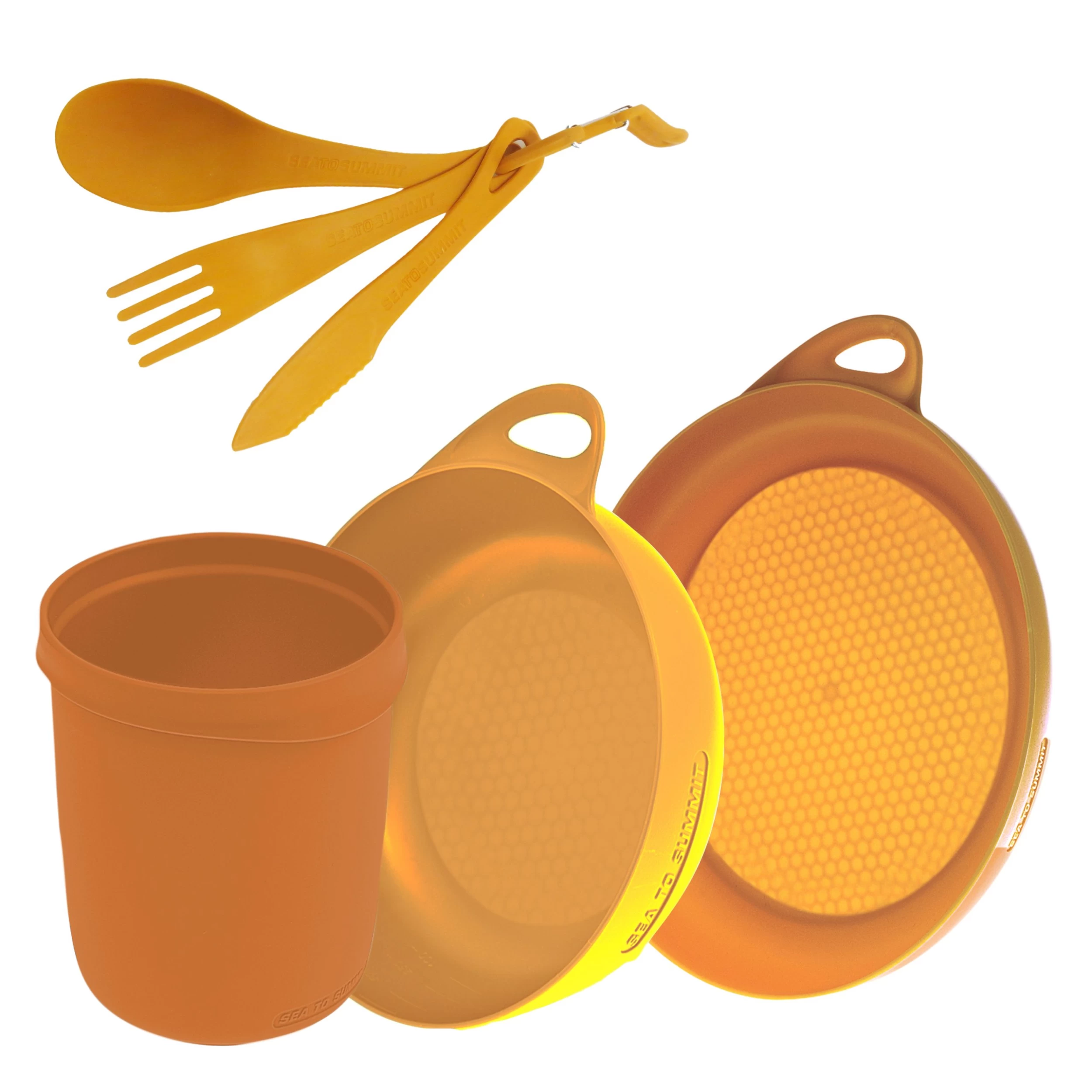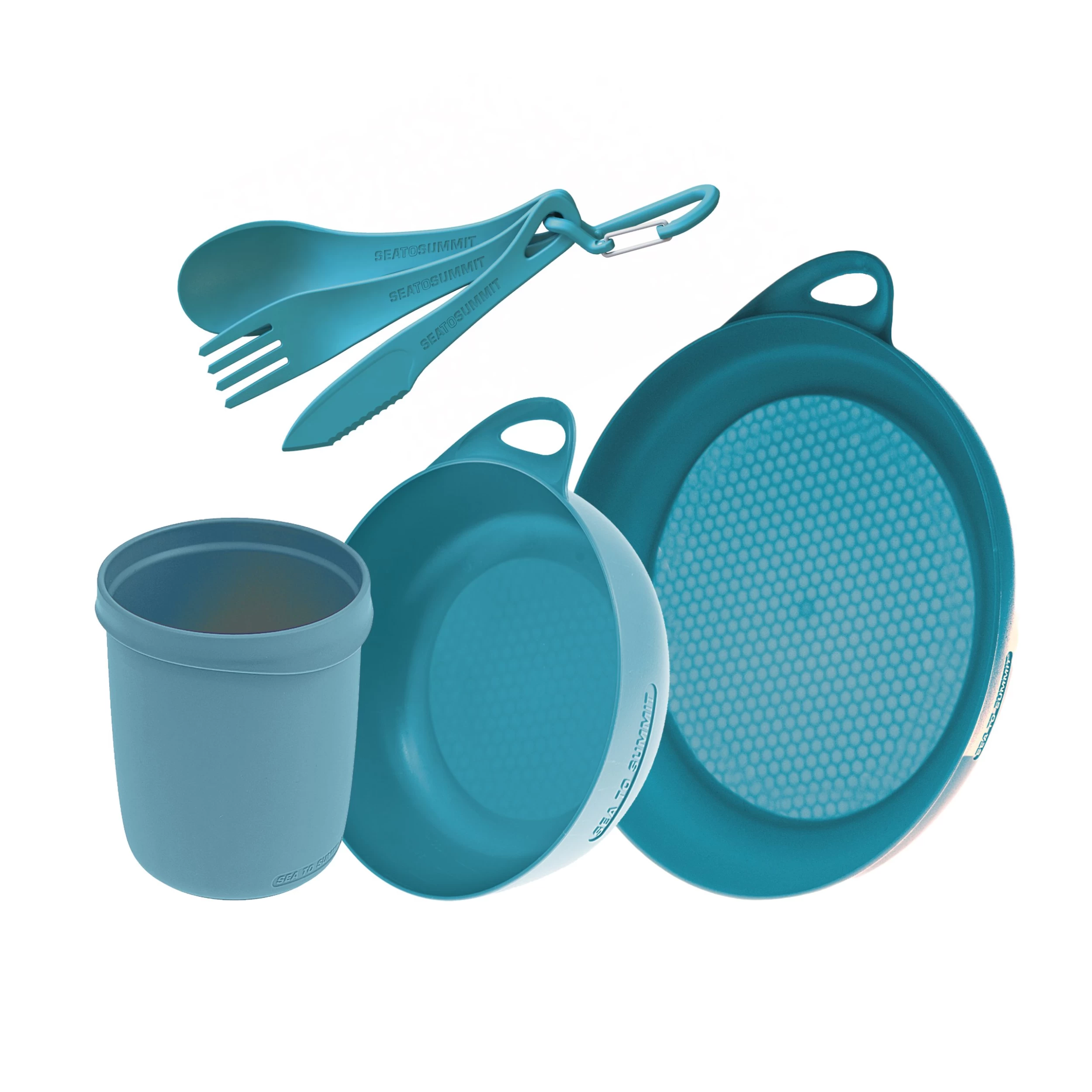 The Delta Camp Set from Sea to Summit is an dinnerware essentials kit that includes a plate, bowl, mug, and 3-piece cutlery set, packaged in a gusseted mesh pouch for easy drying.