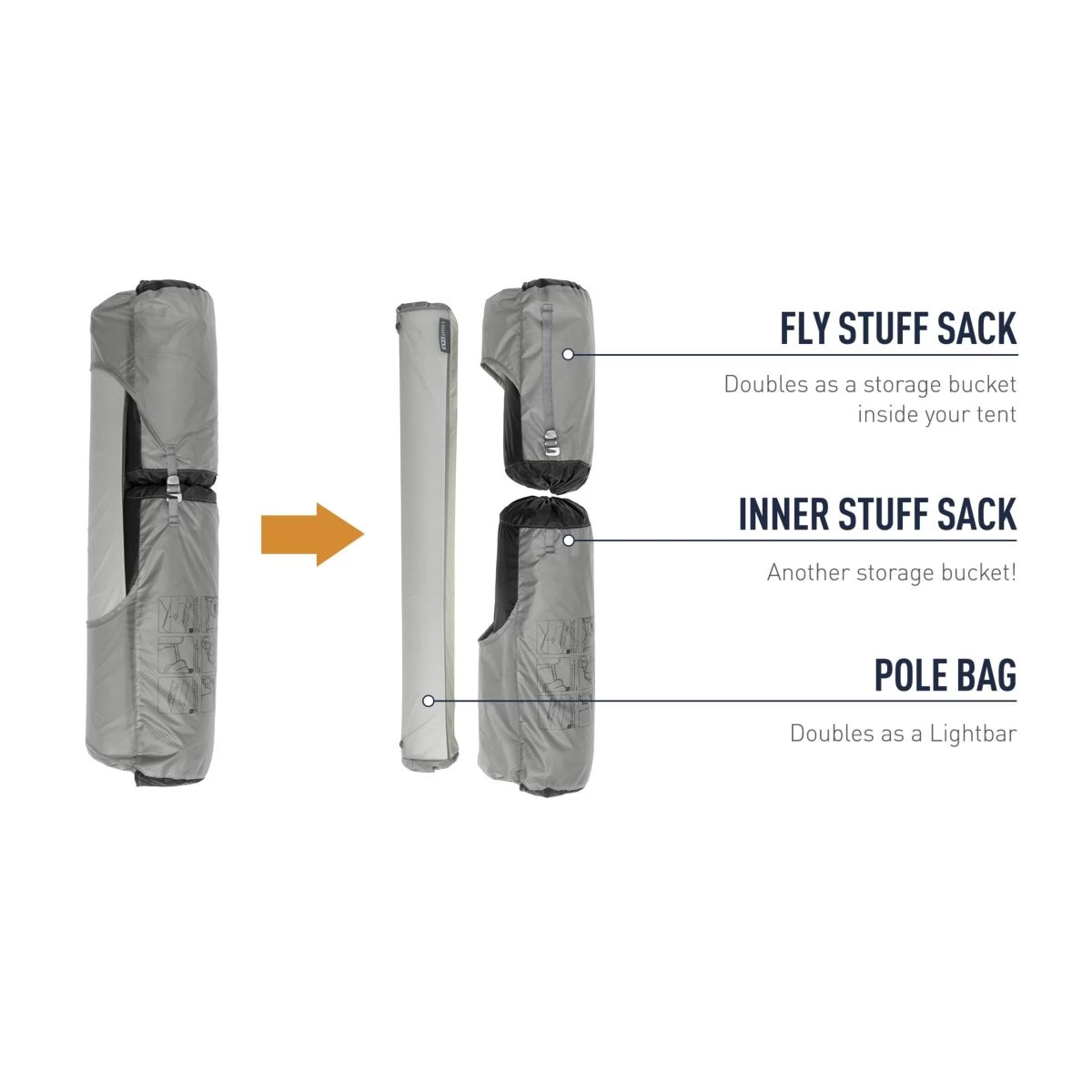 • Lightbar™: add a headlamp and secure the tent pole storage sack to the apex of the tent for soft even illumination (headlamp not included).