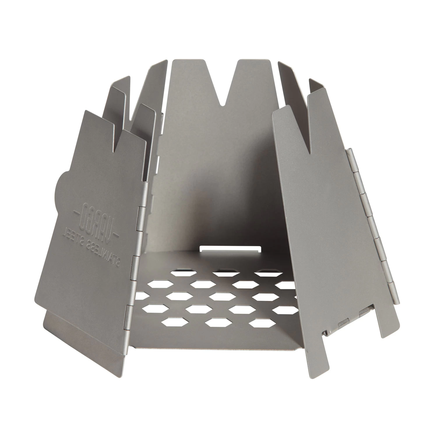 The Vargo Outdoors Hexagon backpacking wood stove folds to a slim compact size, requiring almost no space in your pack. The individual panels are completely hinged and snap easily into place for quick set-up. Durable stainless steel construction is able to endure long term heat without damage. The conical shape focuses heat upward, directing it to your pot, for quick efficient cooking. A hinged access door can be opened or closed for air control, as well as re-fueling.