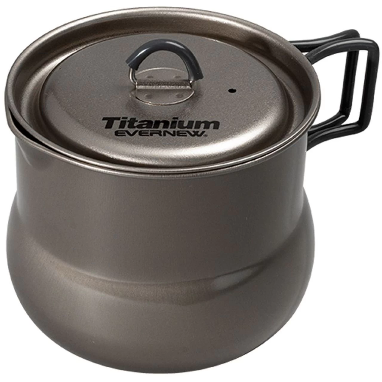 The Evernew Titanium Tea Pot has an oval bottom for increased stability on a stove and a folding handle.