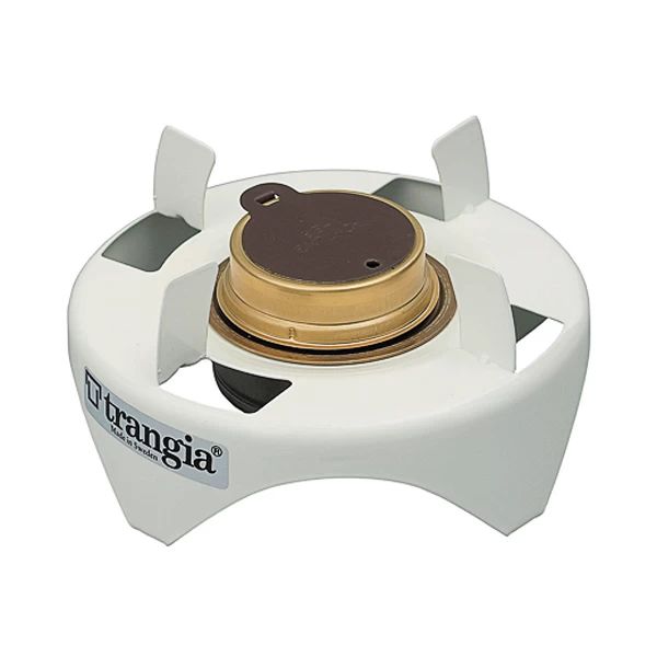 Stove Stand with the Trangia Spirit Burner. An alcohol stove with a simmer ring, the burner can be adjusted from full to simmer and the flame is extinguished when the simmer ring is closed completely. The twist on cap with o-ring seals the burner so you don’t have to empty unused fuel between uses and prevents evaporation. Includes stove stand, burner, simmer ring, and cap w/ o ring.